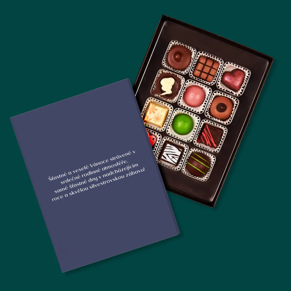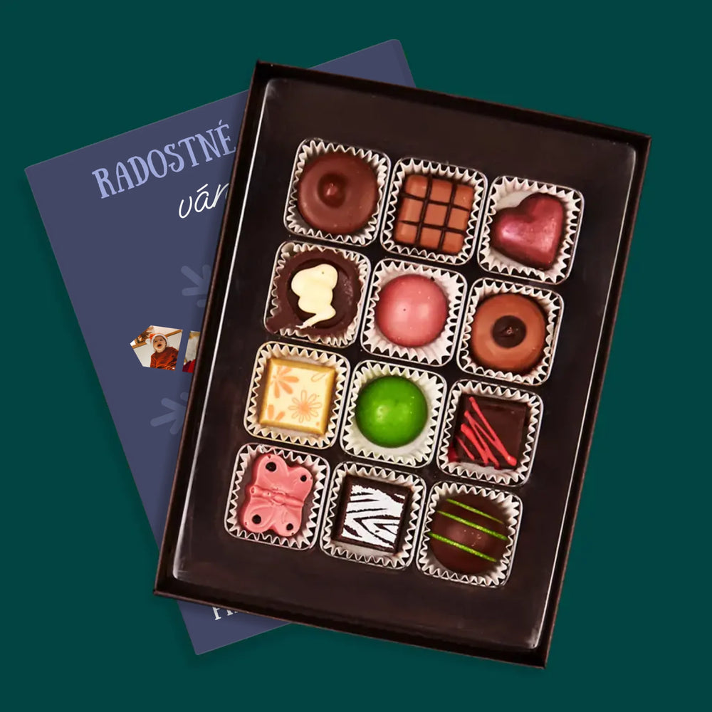Lahodné belgické čokoládové pralinky v elegantní Krabici s naší vlastní personalizací.