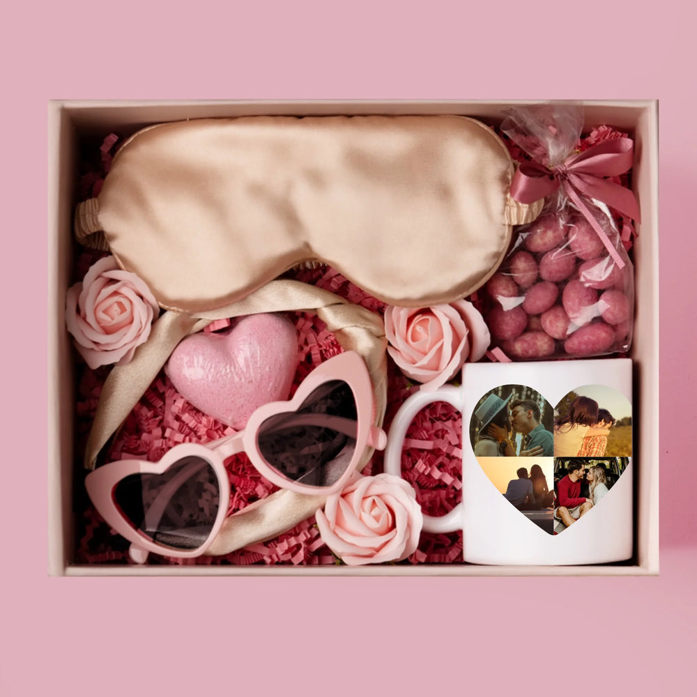 Sada obsahuje mandle v čokoládě, koupelovou bombu ve tvaru srdce, oční masku, brýle ve tvaru srdce a mydlové růže.
